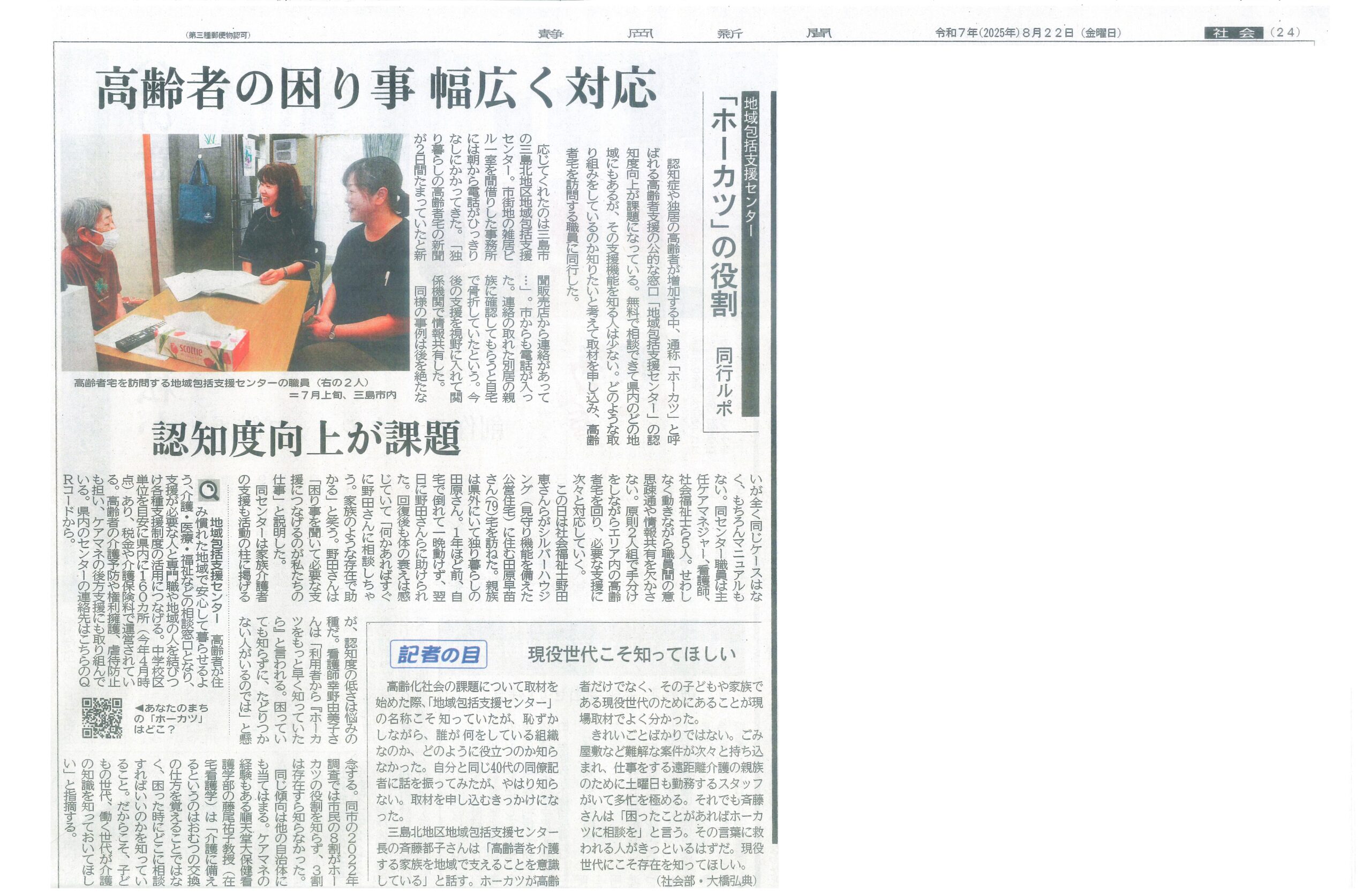 令和7年8月22日の静岡新聞 紙面に、三島北地区地域包括支援センターの取材記事が掲載されました。